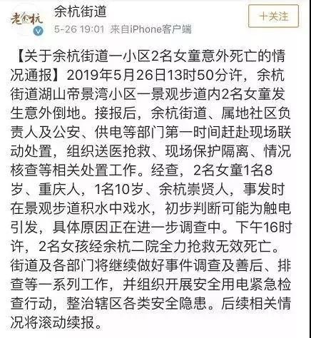 根据余杭街道的通报,2名女童1名8岁、重庆人,1名10岁、余杭崇贤人,事发时在景观步道积水中戏水,初步判断可能为触电引发。