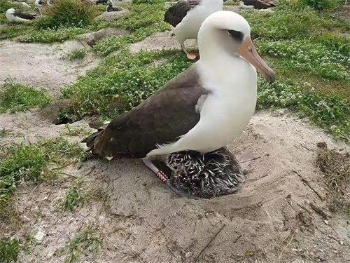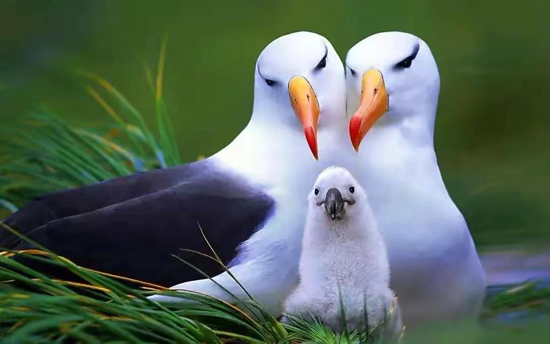 久别重逢的伴侣相聚往往都会有着说不完的事情和腻不完的爱情,它们会互相展翅,梳毛,耳鬓厮磨,告慰安抚,缠绵悱恻,对附近的单身鸟造成十万吨的打击。爱情的结晶往往就是孩子了,有了孩子的家庭总是一切围绕着孩子转,信天翁也不例外。在繁殖季节,雄性信天翁会稍早回到筑巢点,收拾收拾房子,等待雌翁产蛋,然后夫妻轮流孵蛋,等到小信天翁出生。小信天翁会受到无微不至的关爱,直到它们自己能够飞翔