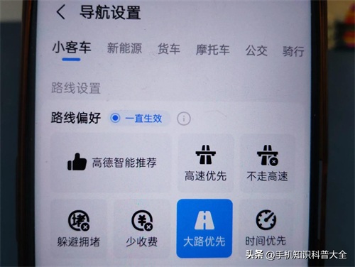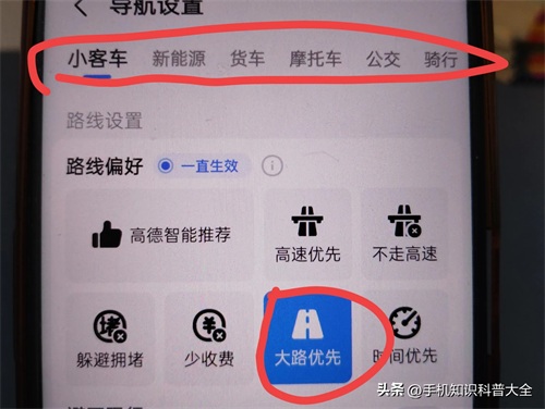 在此能看到“路线偏好”,务必选择“大路优先”,这样能避免走小路,(如上图所示)