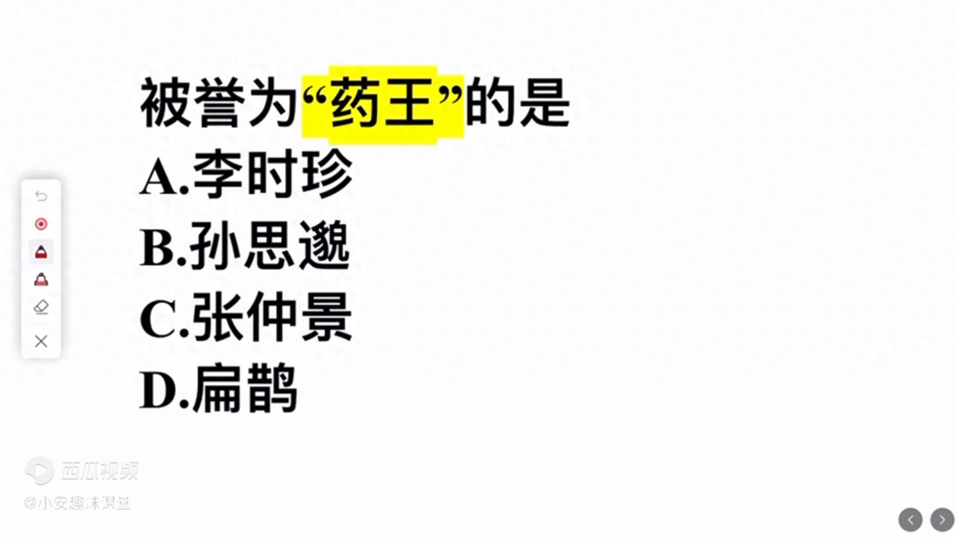 各位同学,你们好!今天我们来看这样一道题目,被誉为药王的是以下哪一位?A.李时珍;B.孙思邈;C.张仲景;D.扁鹊。