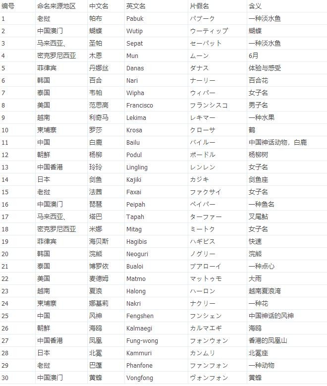 2019年台风命名表