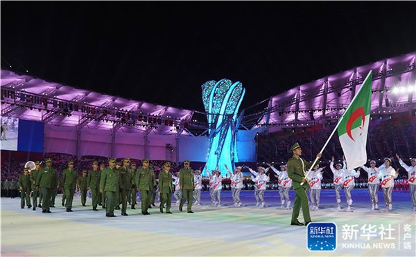 ↑10月18日,阿尔及利亚代表团在开幕式上入场。当日,第七届世界军人运动会开幕式在武汉体育中心举行。新华社记者 金良快 摄