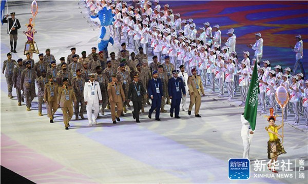 ↑10月18日,沙特阿拉伯代表团在开幕式上入场。当日,第七届世界军人运动会开幕式在武汉体育中心举行。新华社记者 肖艺九 摄