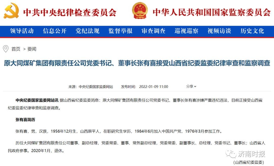 原大同煤矿集团有限责任公司党委书记、董事长张有喜涉嫌严重违纪违法,目前正接受山西省纪委监委纪律审查和监察调查。