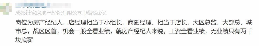 链家员工原话2:机会一般全看业绩,就房产经纪人来说,工资全看业绩,无业绩只有两千块底薪