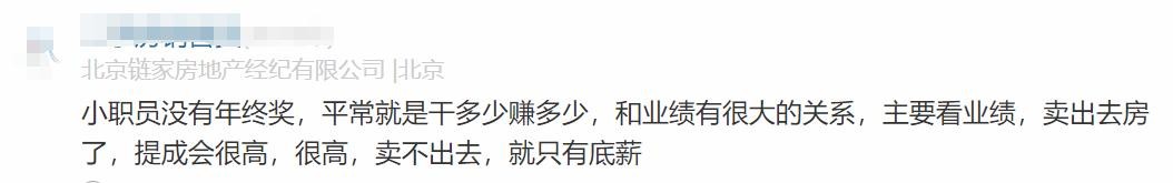 链家员工原话2:小职员没有年终奖,平常就是干多少赚多少,和业绩有很大的关系,主要看业绩,卖出去房了,提成会很高,很高,卖不出去,就只有底薪
