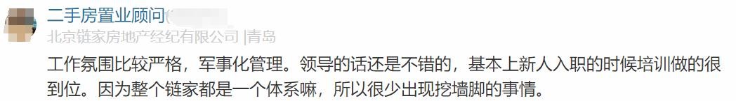 链家员工原话2:工作氛围比较严格,军事化管理。领导的话还是不错的,基本上新人入职的时候培训做的很到位。因为整个链家都是一个体系嘛,所以很少出现挖墙脚的事情。