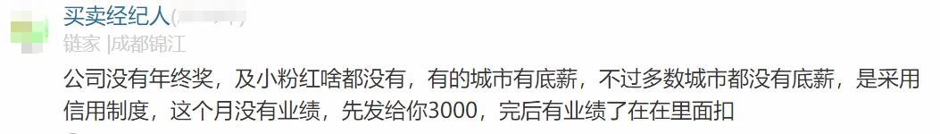链家员工原话1:公司没有年终奖,及小粉红啥都没有,有的城市有底薪,不过多数城市都没有底薪,是采用信用制度,这个月没有业绩,先发给你3000,完后有业绩了在在里面扣
