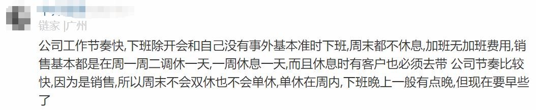 链家员工原话2:每周休一天 串秀 一般都在周一 要9晚7 加班很正常 销售行业嘛。