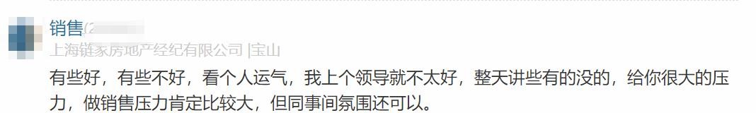 链家员工原话1:有些好,有些不好,看个人运气,我上个领导就不太好,整天讲些有的没的,给你很大的压力,做销售压力肯定比较大,但同事间氛围还可以。