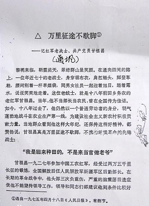 1975年,《人民日报》为了宣传甘祖昌少将的优良作风,以《万里征途不歇脚——记红军老战士、共产党员甘祖昌》为题,对甘祖昌的一生传奇事迹进行了报道。