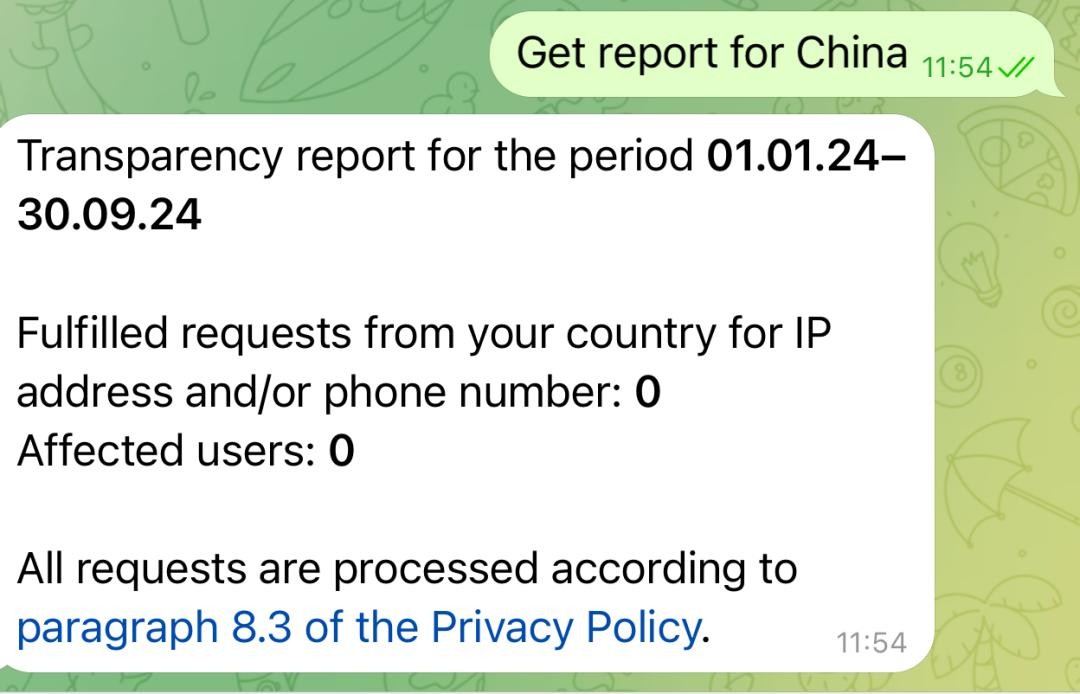 由此可知,Telegram可能会应司法机关要求提供的用户具体信息仅有两个: