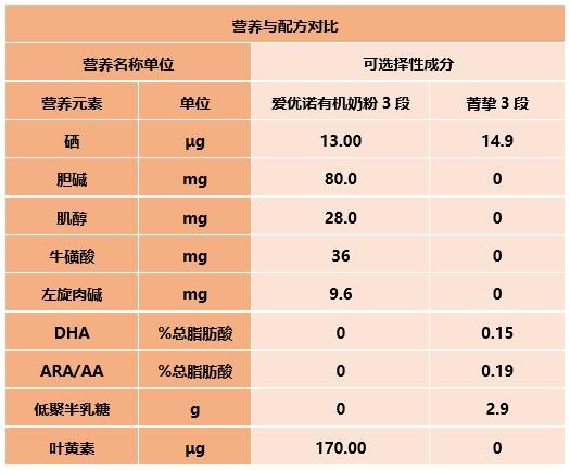 从上图我们可知,爱优诺可选择成分种类多于菁挚,爱优诺可选择性成分有6个,菁挚有4个。爱优诺额外添加的有:胆碱、肌醇、牛磺酸、左旋肉碱、叶黄素。菁挚额外添加的有DHA、ARA/AA、益生元。两者共同添加的有:硒。