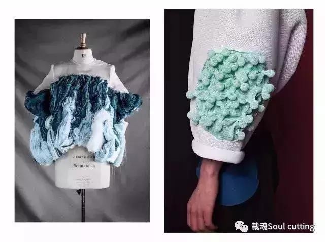 编织和针织常被结合运用,在毛衣中加入不同的织物,比如皮绳、织带、麻绳、牛仔条等,既又不同材质的对比运用又能对比毛衣具有更加的挺括感。