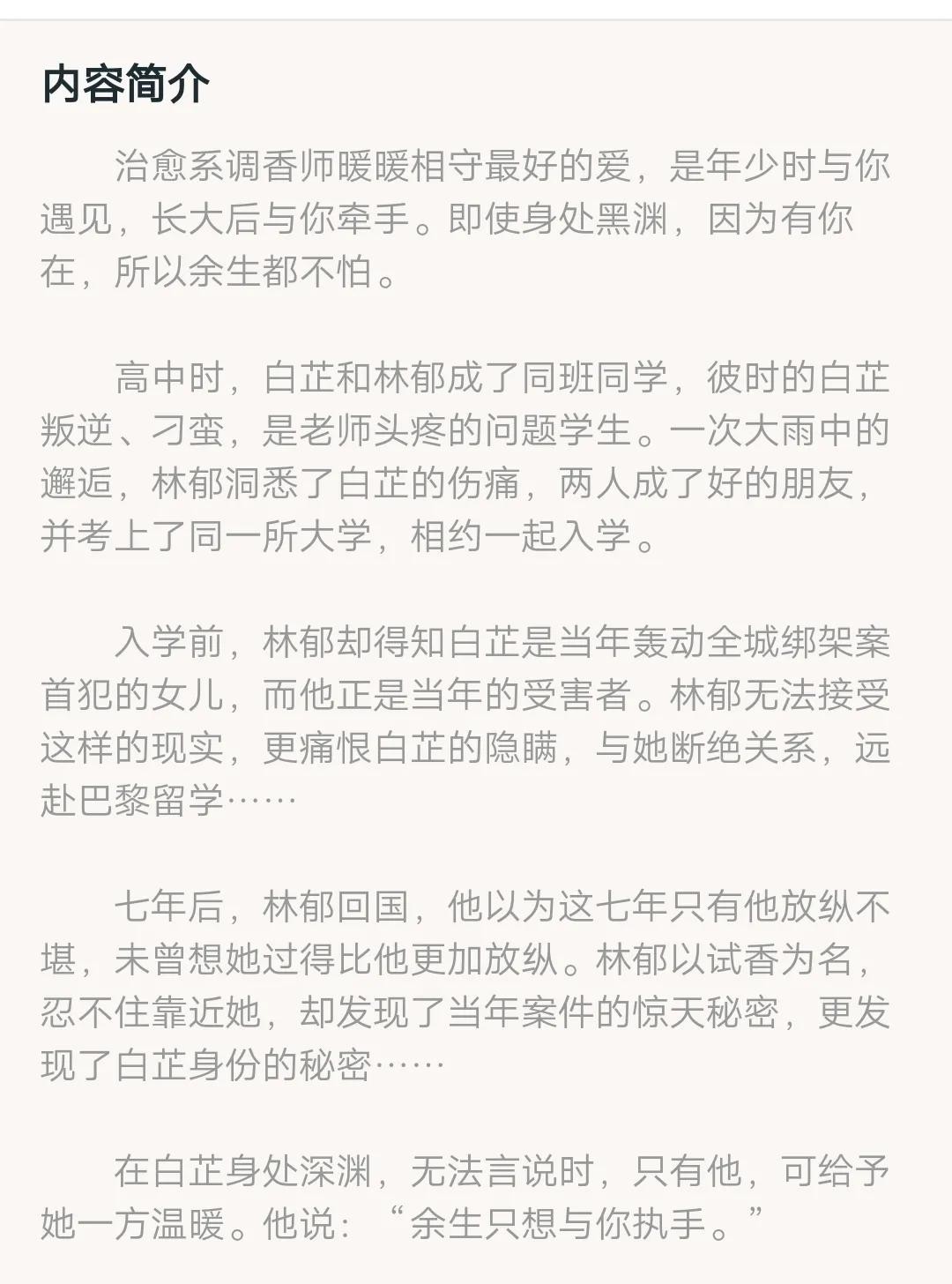 林郁,本是天子骄子,十岁那年亲眼目睹了母亲的中枪身亡后,变成了一个失去嗅觉还自闭的孩子。在一个暴雨倾盆的雨夜,他邂逅了刚刚被母亲抛弃的白芷。也许是同样受过心灵的创伤吧,身份地位截然不同的两人居然很快成了好友。
