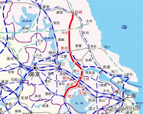 红色为盐泰锡常宜城际铁路,泰州、常州到上海、杭州、南京时间相近