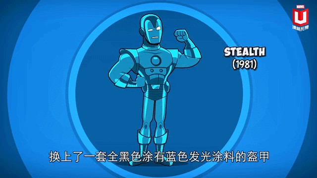 这套战甲出现在1981年的漫画里,当时为了执行特殊任务,做了一套全黑涂了蓝光的盔甲,更重要的是有隐形装置,并且瘫痪电子设备,干扰雷达