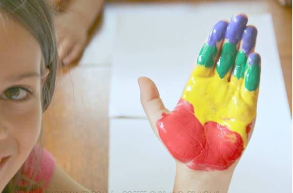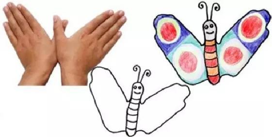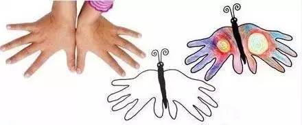 1、像下图所示,把不同颜料涂在孩子的掌心。