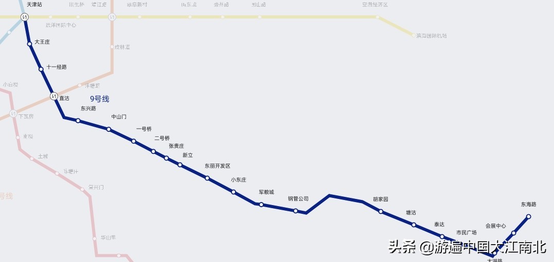 天津地铁9号线(津滨轻轨)是天津首条轻轨线路,于2004年4月1日正式运营,标识色是深蓝色。