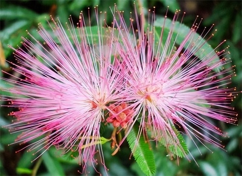 合欢树是一种落叶乔木,高可达16m,非常高大耐看。而合欢花又是非常的可爱,呈粉红色或紫红色,花萼是管状的,一簇一簇地绽放在枝头,满满的少女心。高大的树干与娇艳的花朵搭配,真的是美不胜收!