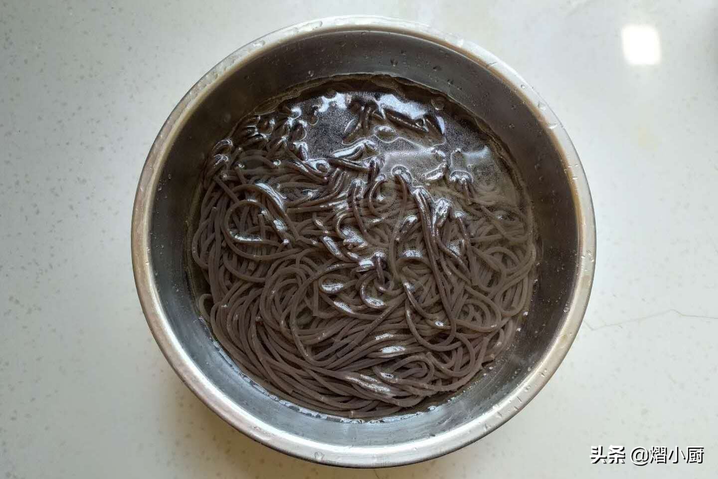 3、将泡好的蕨根粉,捞出放入凉水中,过凉,这样做是为了吃蕨根粉时,口感凉爽而且还不会发黏,不会发砣。过凉后,捞出沥干水分,一定要把水分沥干,这样做是为了浇好料汁后,鲜香适口,食用起来才不会没有味道。