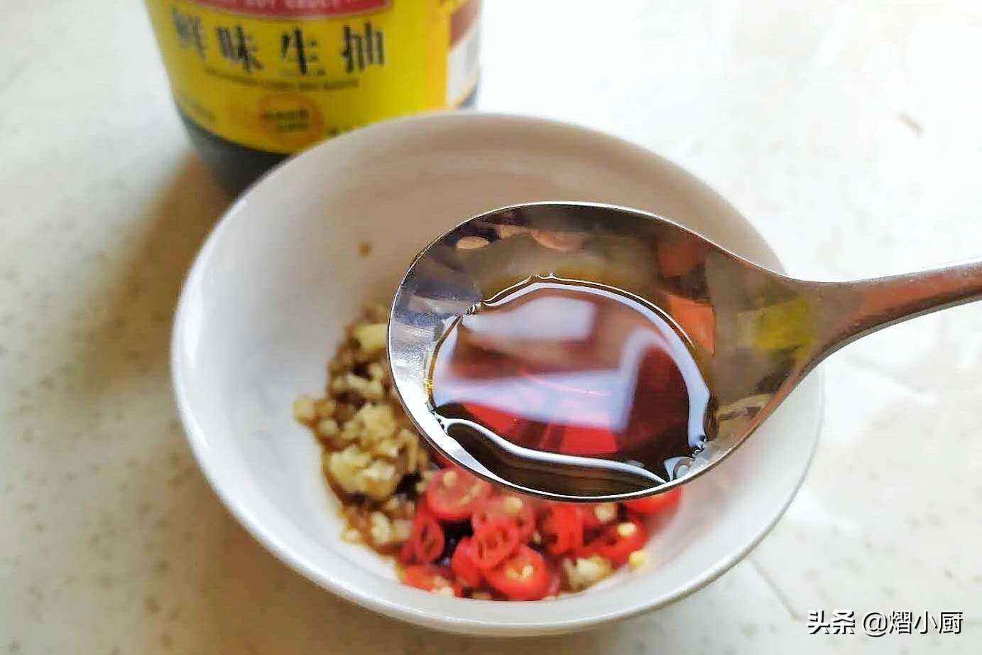1、调料汁:取一空碗,将切好的蒜末和小米辣圈放入碗中,加入1勺白糖、1小勺盐、1勺香醋、1勺生抽,1勺油泼辣椒面,搅拌均匀,调好的料汁味道清淡不腻、鲜辣不燥、酸甜适口即可。