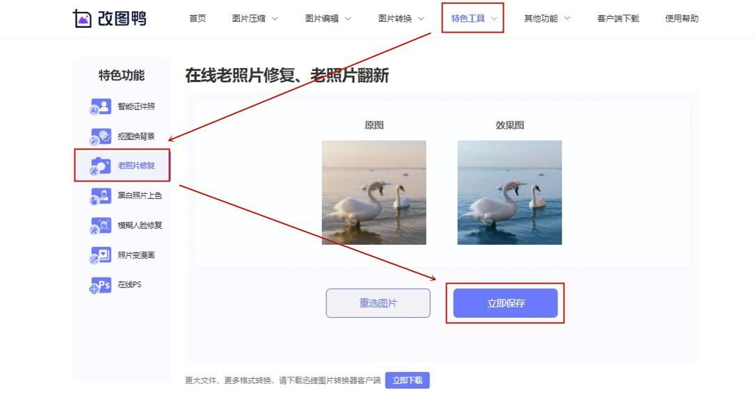 在浏览器中搜索“改图鸭”工具,并在线打开,在上方的“特色工具”一栏中选择“老照片修复”功能,上传要变清晰的图片之后,等待修复完成就可以得到清晰的图片了,点击“立即保存”按钮就可以将清晰的图片保存下来。