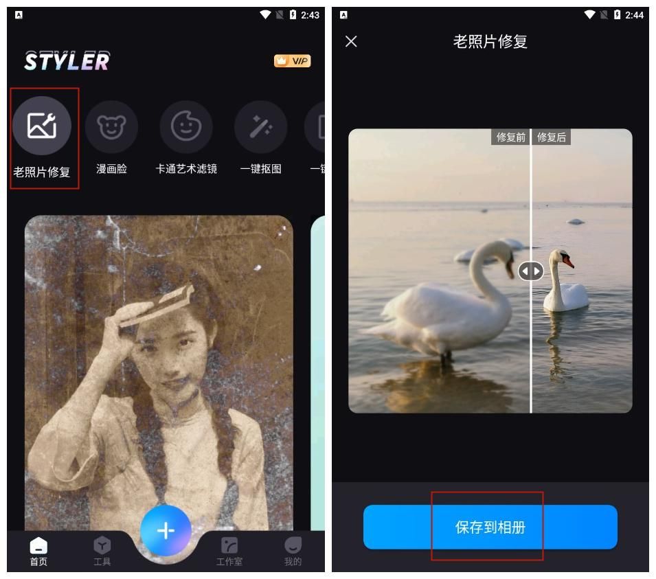打开软件,选择“老照片修复”功能上传要变清晰的图片,稍等一会软件就会完成修复操作,并生成修复前后的对比图,点击“保存到相册”按钮就可以将修复完成的清晰图片保存下来了。
