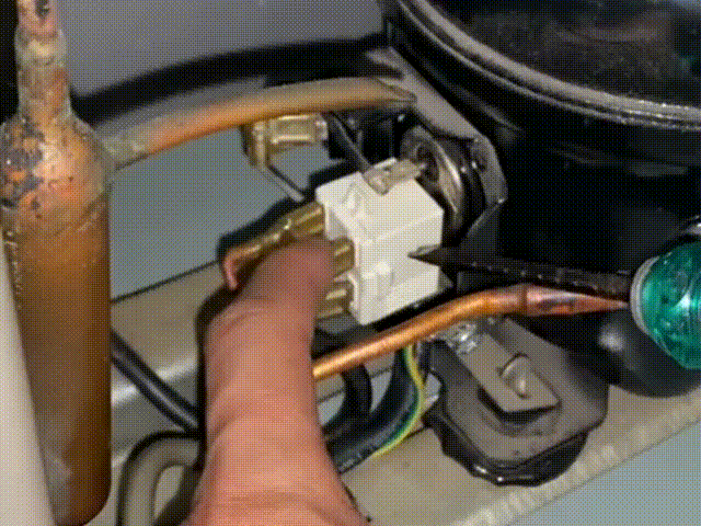 此外,还需拔下压缩机启动器,进一步判断启动器好坏。轻轻摇晃启动器,启动器坏了有哗啦响的声音,则有可能是启动器坏了。