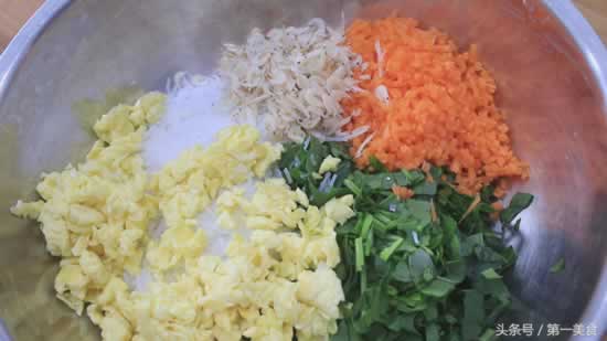 洗净后的菠菜一把,切碎以后放在一起,胡萝卜切成胡萝卜粒也放在盆中,再抓入一把虾米,