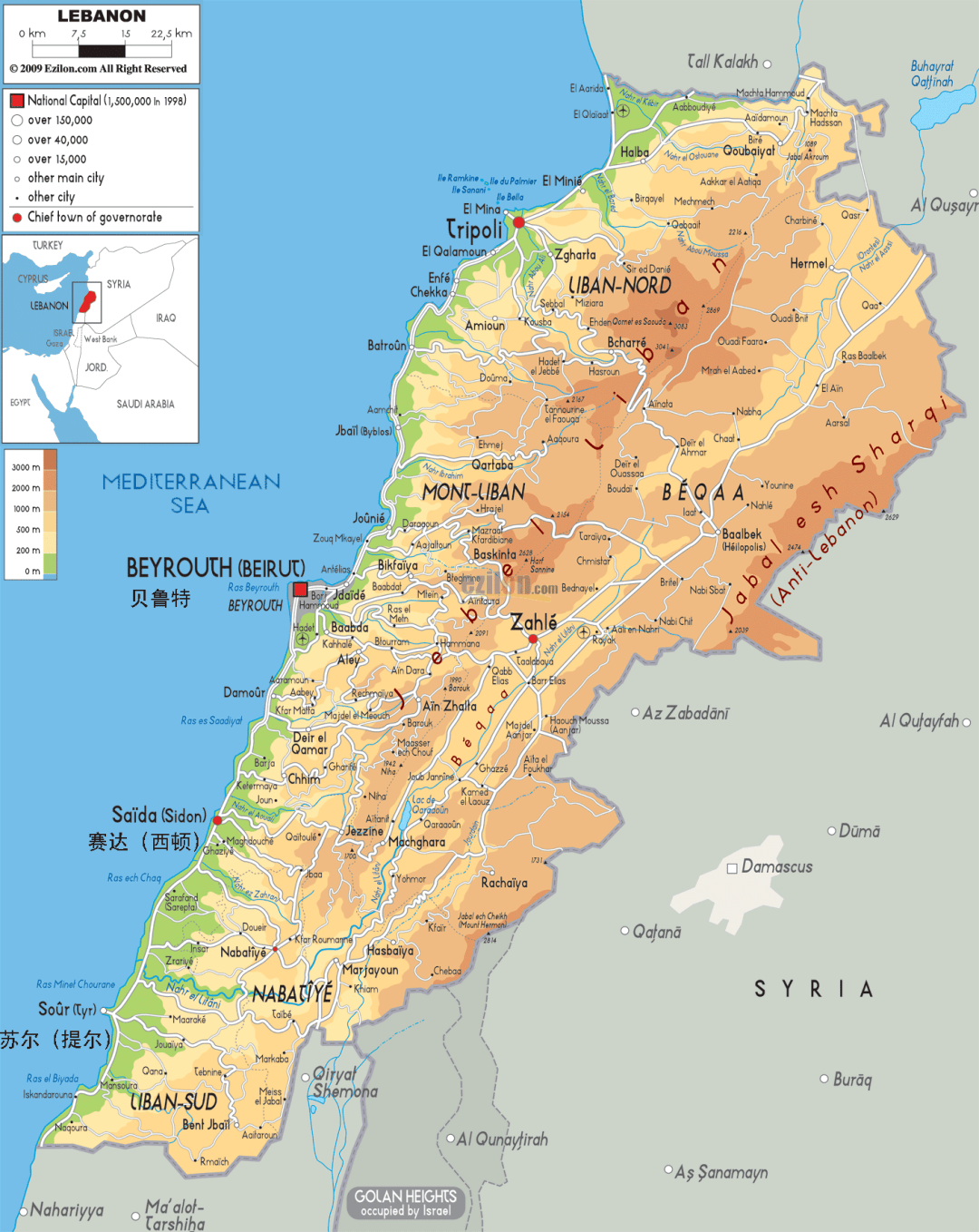 位于亚洲西部,地中海东岸,北部和东部毗邻叙利亚,南部与以色列接壤。