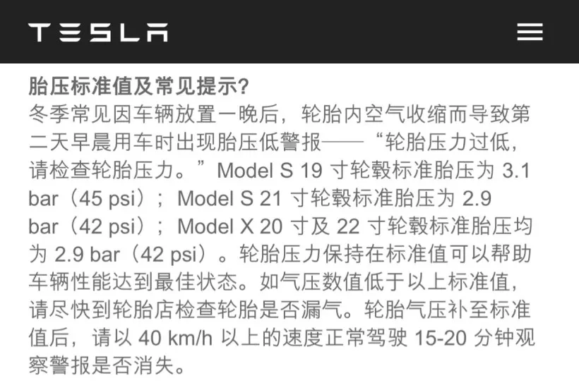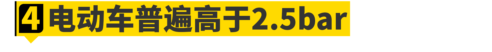 此外,虽然近些年各大轮胎品牌也纷纷为更重的电动车推出了电动车专用轮胎,但纵观整个电动车市场就会发现,使用燃油车轮胎的电动车数量依然占绝对的主流地位。并且像是特斯拉这种电动车轮胎和燃油车轮胎混用的品牌,也找不到哪台低于2.9bar原厂标准胎压的车型。所以目前电动车的胎压还不好一概而论,车主各自参考厂家的建议就好。不过,从整体来看,目前电动车的胎压普遍都是要大于2.5bar的。