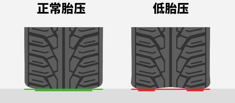 在了解了什么是胎压后,下面咱们再来看看胎压不足以及胎压偏高会对车辆造成什么影响。当车辆的轮胎胎压偏低时,由于胎压不足以撑起轮胎的关系,所以胎面的形状就会发生改变,从轮胎的滚动方向看会呈现出“凹”字形的样子,即轮胎花纹两边的接地压力大于中间花纹的接地压力,最终轮胎胎面便会因为没有完全接地,出现抓地力大幅下降的问题。