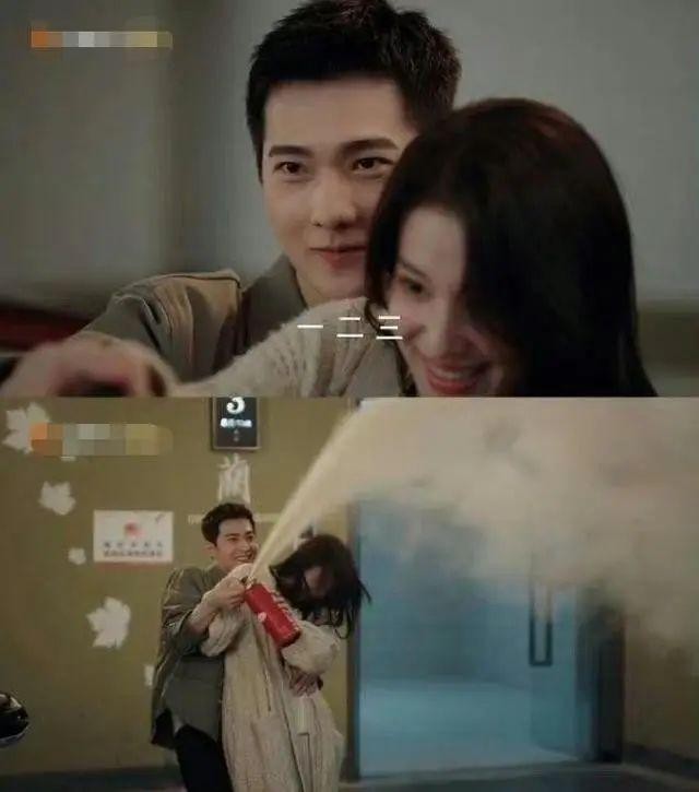 男主为逗女主开心,搂着对方拿灭火器像开香槟一样制造浪漫。