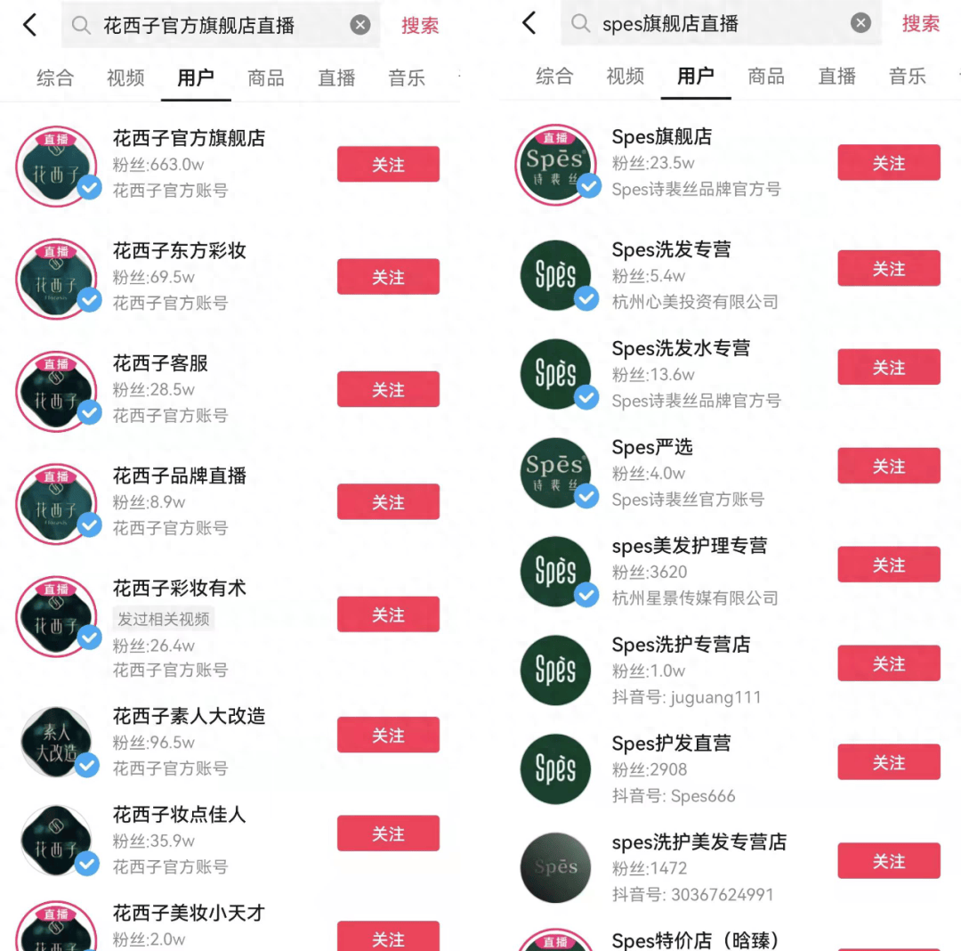 这种GMV的快增长与花西子在抖音上多店铺联合直播的模式有关。打开抖音平台可以发现,花西子在抖音上有10个认证的蓝v账号,其中一半都正在直播卖货。spes也有超5个蓝v认证的官方店铺直播卖货。