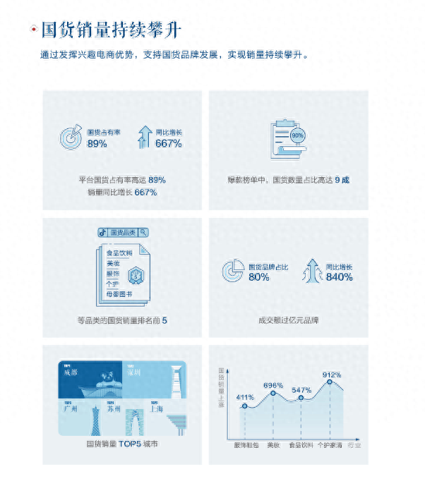 据了解,抖音电商将“国货品牌”作为重要发力点,以“助力新锐品牌发展”和“帮助老字号焕发生机”为抓手,通过推出多项扶持措施,如出台新品专项扶持、推出抖音电商排行榜、制定“抖品牌”专项扶持计划等,助力平台品牌发展。