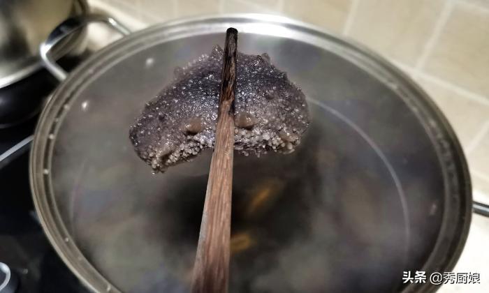 第五步:取一个无水无油,保温性好一些的大锅,将海参放入锅中,然后加入足量纯净水,水要没过海参10厘米,盖上锅盖,大火煮开,然后转中小火煮30-40分钟,将海参煮熟。(用筷子夹住海参中间,海参两头自然下垂,证明海参已煮熟。)海参煮熟后不要着急拿出,在锅内焖制自然放凉。