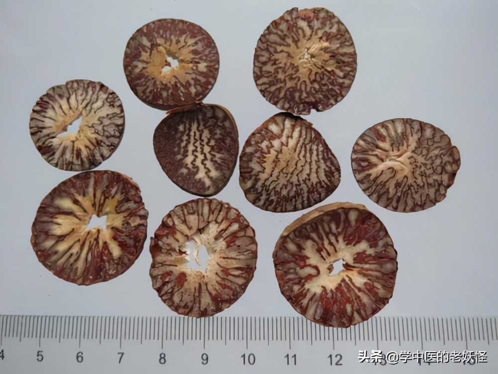 今天讲讲槟榔,驱虫药的一种,也是比较常见且使用频率较高的驱虫药。槟榔主要产地是海南、台湾,包括福建、广西等地区也有分布。属于棕榈科植物,以其干燥成熟的种子入药。在果实成熟后收集,用水煮一遍,然后干燥,除去果皮,将里面的种子取出,如下图。将取出的种子晒干,切成图示片状使用,也可以将其捣碎使用。