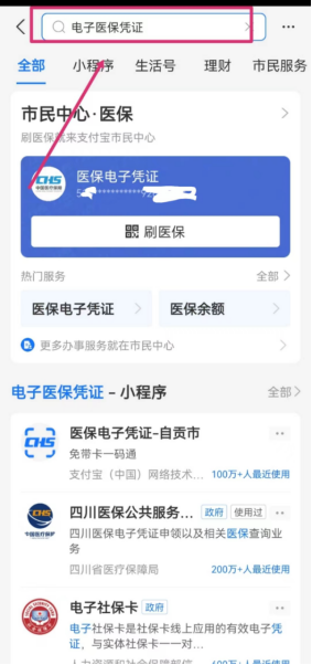 打开我们的支付宝或者微信,搜索“电子医保”,如下图,然后根据提示输入身份证、电话号码注册就可以了。