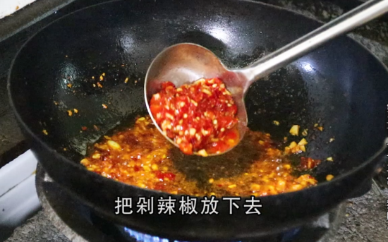 11、起锅倒油,油烧至冒青烟,把辣椒酱放下去炒香,再把大蒜倒下炒香,放点豆瓣酱,最后把剁辣椒放下去翻炒。