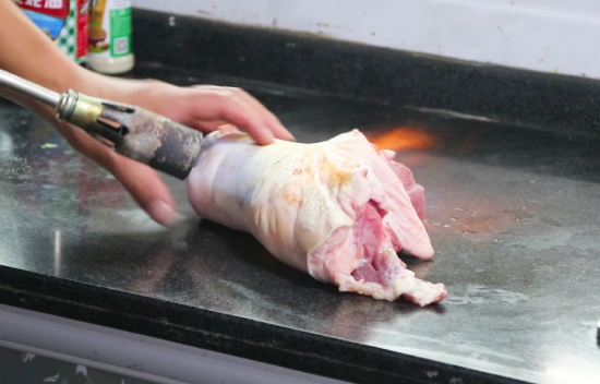1、把准备好的猪肘子先用喷枪修一下皮,把毛烫掉,再用刀刮干净,清洗干净。(可以提前在卖猪肉的老板那里处理好)
