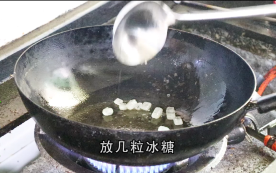 4、起锅,把锅烧热转小火,把冰糖放下去炒,炒至冰糖变色起泡,再加点水,水开后,糖色就炒好了。
