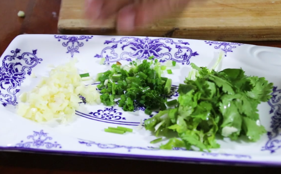 9、切点配菜:大蒜切碎,葱切成葱花,切点香菜备用。