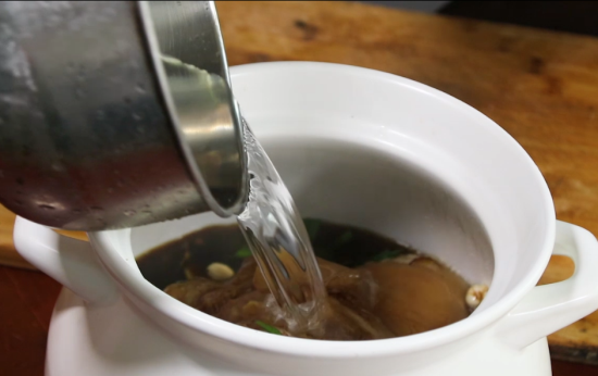 5、把冰糖水倒进砂锅里,放适量生抽和老抽,再倒入清水,清水没过猪肘子就可以了。