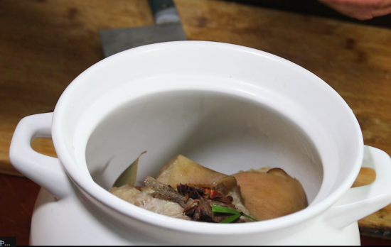 3、把焯了水的猪肘子放入砂锅里备用,放点香料:花椒籽,放点八角,桂皮,香叶,还有自己种的香草和生姜。