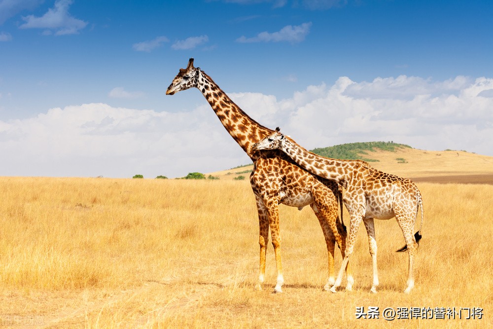 长颈鹿可不仅仅有长脖子,它们还有大长腿,站立的时候身高可以达到6-8米,是陆地上最高的哺乳动物。长颈鹿虽然属于哺乳纲、偶蹄目,但是却十分另类。它们的牙齿是原始的低冠类型,因此不能以草为主食,只能以树叶为主食,进食后还会将胃中半消化的食物返回嘴里再次咀嚼。长颈鹿生活的环境干旱缺水,使得它们进化出了极强的耐渴能力,大家知道长颈鹿可以多久不喝水吗?
