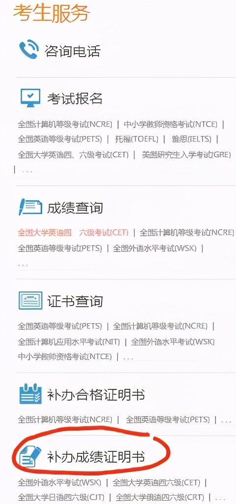 2.点击网站右下方“考生服务”栏的“补办成绩证明书”。