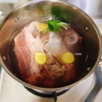 3、牛肉下锅,加开水没过牛肉,加入卤料包,加少许蚝油、生抽、老抽,大火煮沸。随即小火炖煮两小时。