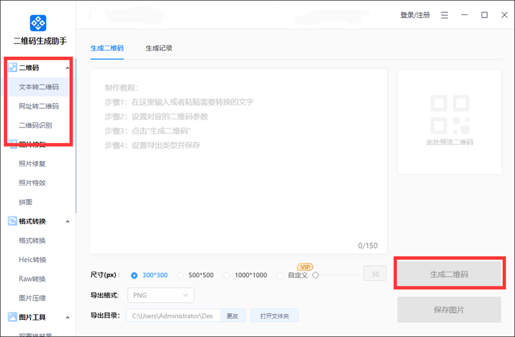 这是一个电脑端的二维码制作软件。进入软件首页后,我们可以看到左侧工具栏中的二维码选项。我们可以选择【网址转二维码】、【文本转二维码】和【二维码识别】的操作,可以根据自己的需求选择一个合适的功能。选择后,可以进入生成页面。生成的二维码可以直接保存。