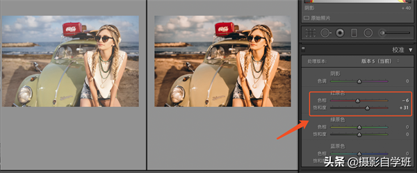 饱和度里面橙色和黄色是呈降饱和的状态,控制的是人的肤色和沙滩的颜色,绿色、浅绿色、蓝色,这几种颜色,不想在照片里面呈现太多,因为我们开篇就说了,这幅图的调节是偏暖色的,所以它们饱和度,都降到了最低。